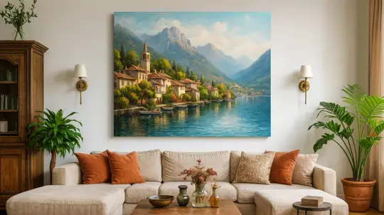 - Neben hohen Möbelstücken wirken horizontale Bilder besonders ausgewogen – sie gleichen die Höhe optisch aus.