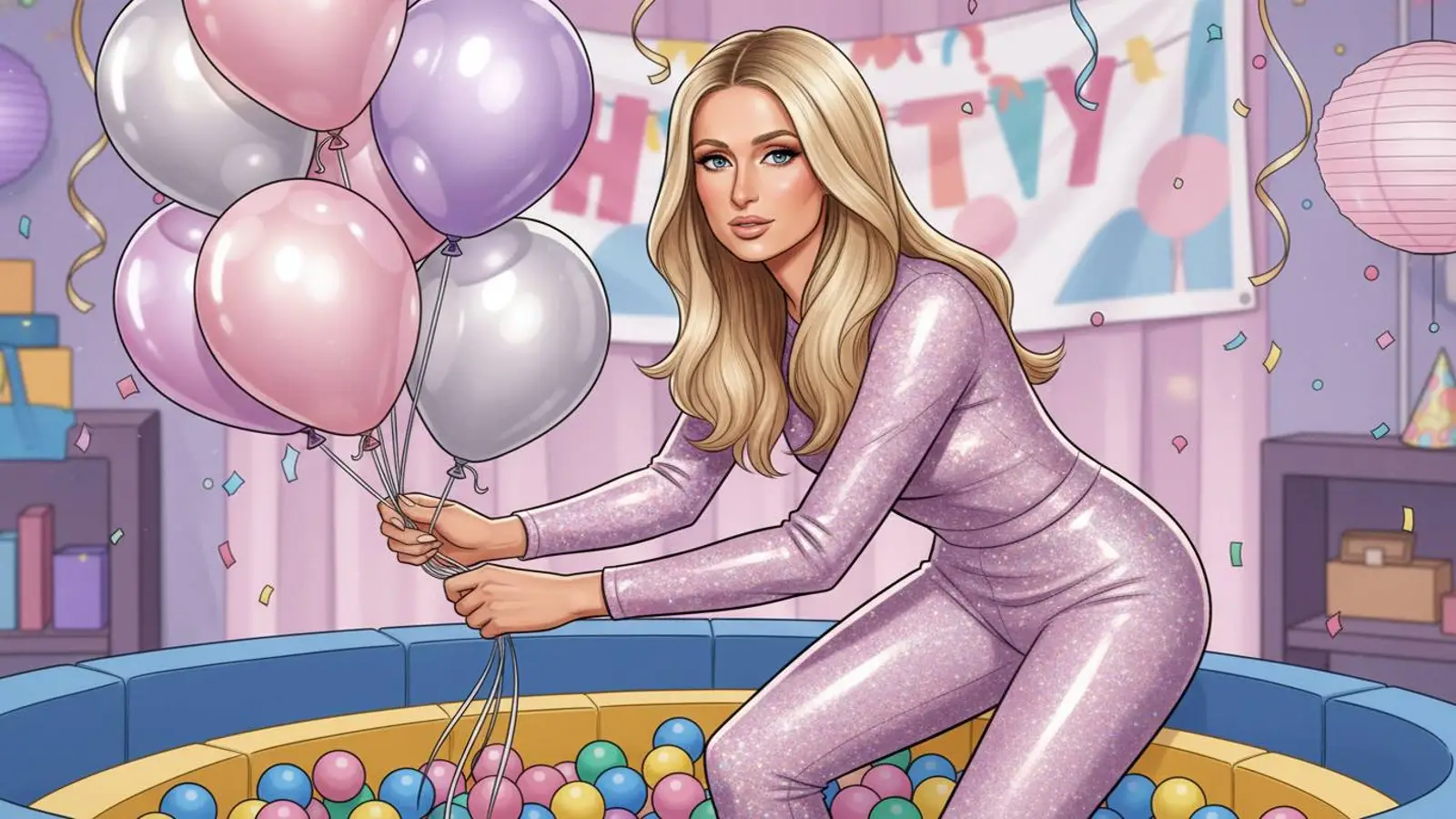 Pour la reine du jour, Paris a imaginé un véritable univers de jeu : piscine à balles, mini salon de beauté, coin dessin et photobooth avec des chiots. Le choix canin n’avait rien d’anodin : elle voulait mettre en lumière un refuge local et ses animaux.