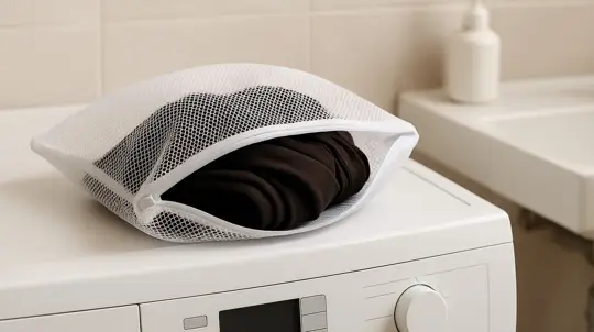 मुलायम जाली वाला लॉन्ड्री बैग स्टॉकिंग्स को अनचाहे नुक़सान से बचाता है। अगर बैग न हो, तो गाँठ लगी तकिये की खोल भी काम आ सकती है। ज़रूरी यह है कि स्टॉकिंग्स का सीधा संपर्क ज़िप, बटन या सजावटी हिस्सों से न हो, क्योंकि वे धागे खींच सकते हैं।