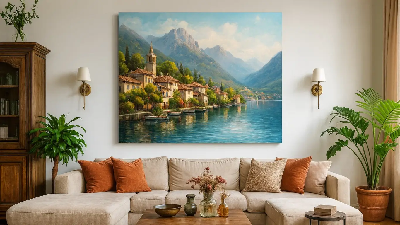 Главный принцип — картина должна быть на уровне глаз и чуть ниже, чем интуитивно хочется повесить. Так взгляд не будет уставать, и изображение станет естественной частью пространства.