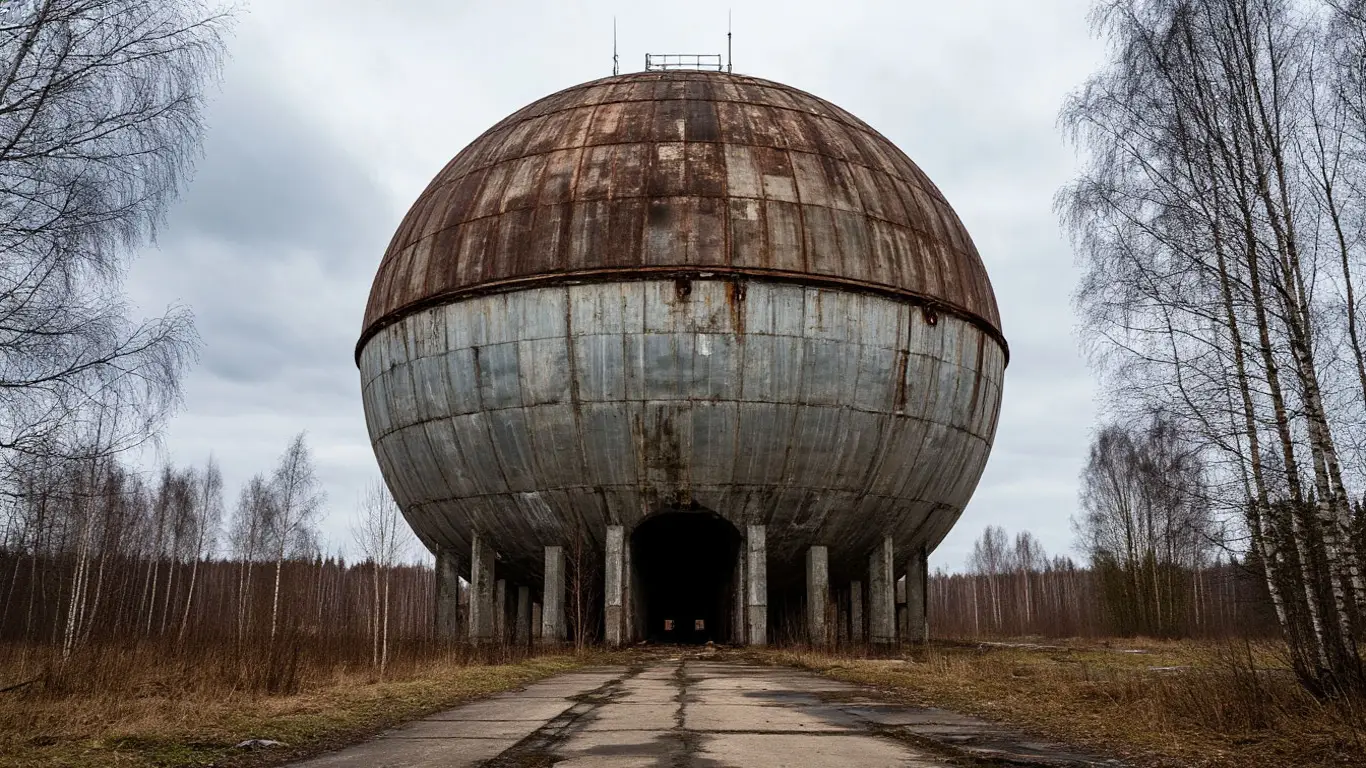 В Кимрском районе Тверской области, недалеко от деревни Игнатово, стоит необычная заброшенная конструкция в форме огромного шара. Его диаметр составляет около 18–20 метров. Несмотря на запустение, объект продолжает привлекать внимание туристов и любителей необычных мест.