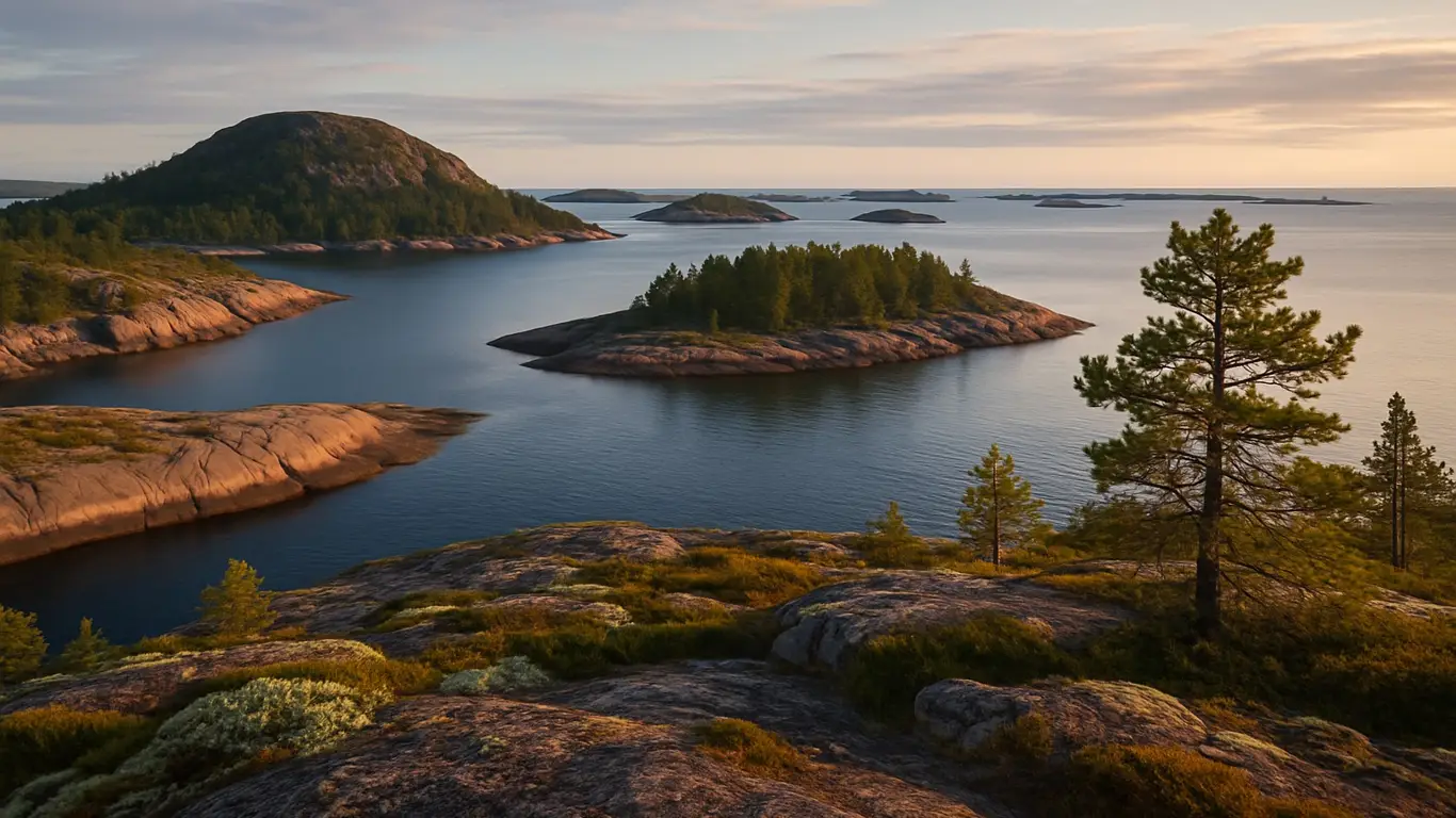 Северные острова шхер — территория спокойствия. Сюда приплывают белухи, а в литоралях легко искать мидии и ламинарию. Закаты видны прямо над водой.
