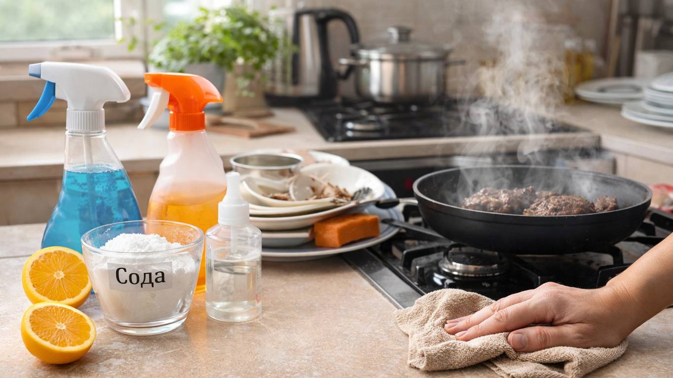 Запах держится на поверхностях, поэтому обычной мойки посуды недостаточно. Нужно протереть столешницы, плиту, фартук, шкафы и стены рядом с плитой. Для этого подойдёт обычное средство для кухни. Если запах сильный, используют воду с уксусом или содой. Не стоит забывать про ручки шкафов, выключатели и внешнюю поверхность холодильника — на них тоже оседают частицы жира.