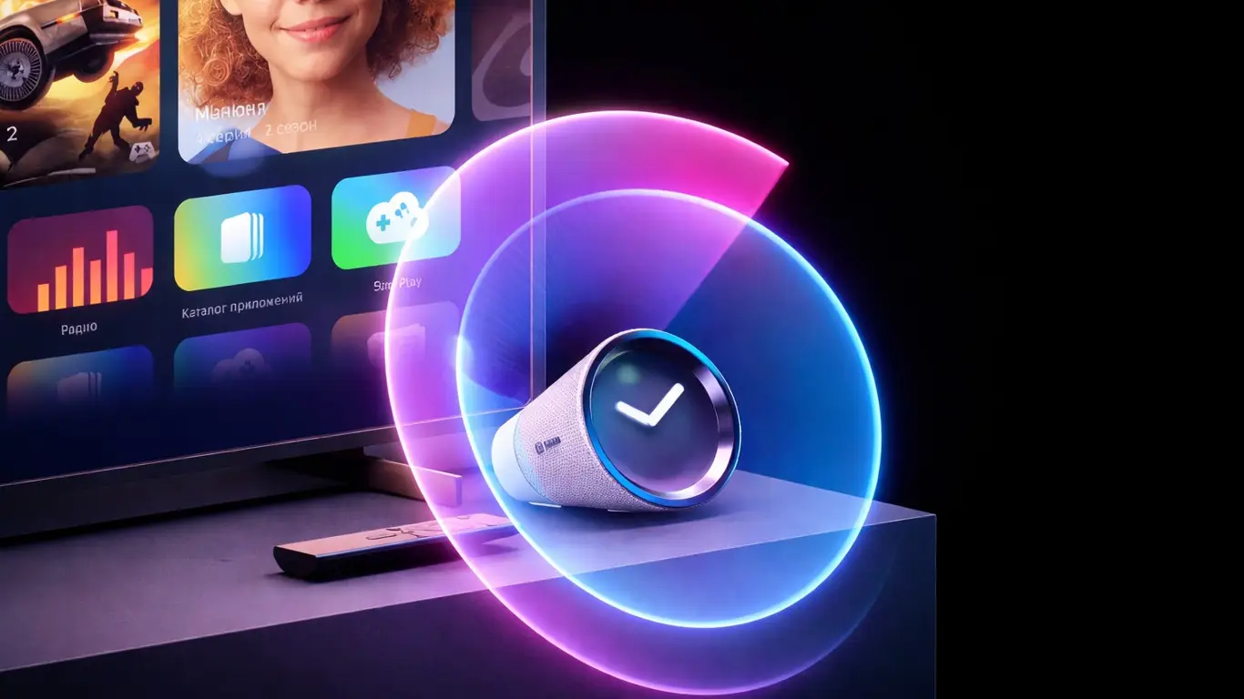 В устройстве установлены пять микрофонов. Они улавливают голос даже на расстоянии и в шумной комнате. Это особенно удобно, когда телевизор уже включён или играет музыка. Команды работают просто: можно попросить поставить фильм, включить конкретный канал, найти видео, переключить трек или изменить громкость. Управление ощущается привычно уже через пару дней использования.