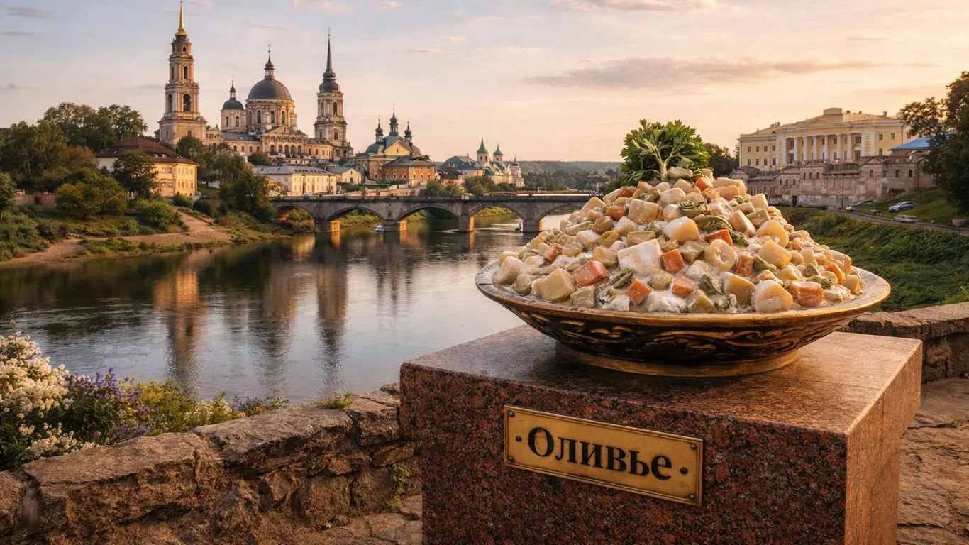 Помимо классических монументов Пушкину и историческим деятелям, в Торжке есть памятник… салату оливье. Он стал современным символом города и уже давно привлекает туристов. Такой контраст вполне отражает характер Торжка — серьёзного и ироничного одновременно.