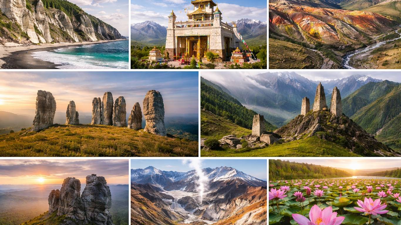 Россия часто удивляет даже тех, кто путешествует по стране не первый год. Стоит показать друзьям несколько кадров — и в ответ нередко звучит: «Это точно у нас?». Причина простая: в одном государстве уживаются вулканы и пустынные пейзажи, буддийские храмы и северные плато с каменными столбами, лотосовые поля и острова с белыми скалами у холодного моря.