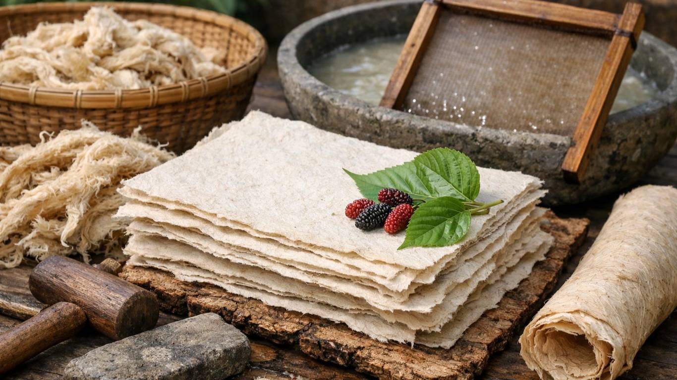 Производство начинается со сбора коры шелковицы. Её вымачивают, затем варят и тщательно измельчают до однородной мягкой массы. Из этой массы вручную формируют листы, используя специальную форму, напоминающую сито.