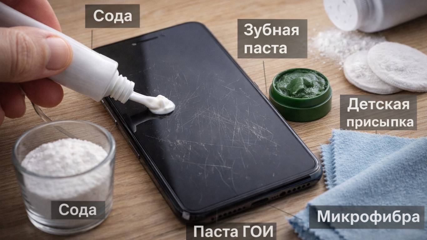 Один из самых известных методов — полировка экрана зубной пастой. Его любят за простоту: паста есть почти в каждом доме, а действие у неё относительно мягкое. Смысл в том, что в составе паст часто есть мелкие абразивные частицы. Они работают как лёгкий «скраб» — примерно так же, как паста очищает эмаль.