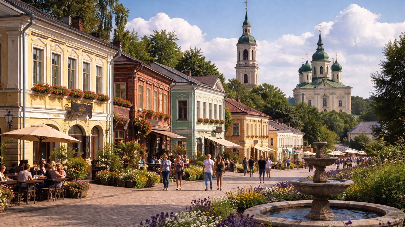 Село Вятское находится примерно в 40 километрах от Ярославля, но по настроению оно выбивается из привычной картины российской глубинки. Здесь не нужно долго искать «центр» — старинные дома тянутся вдоль главной улицы почти ровной линией, фасады выглядят ухоженно, вывески аккуратные, а вместо привычного сельского молчания слышны экскурсии и разговоры туристов.