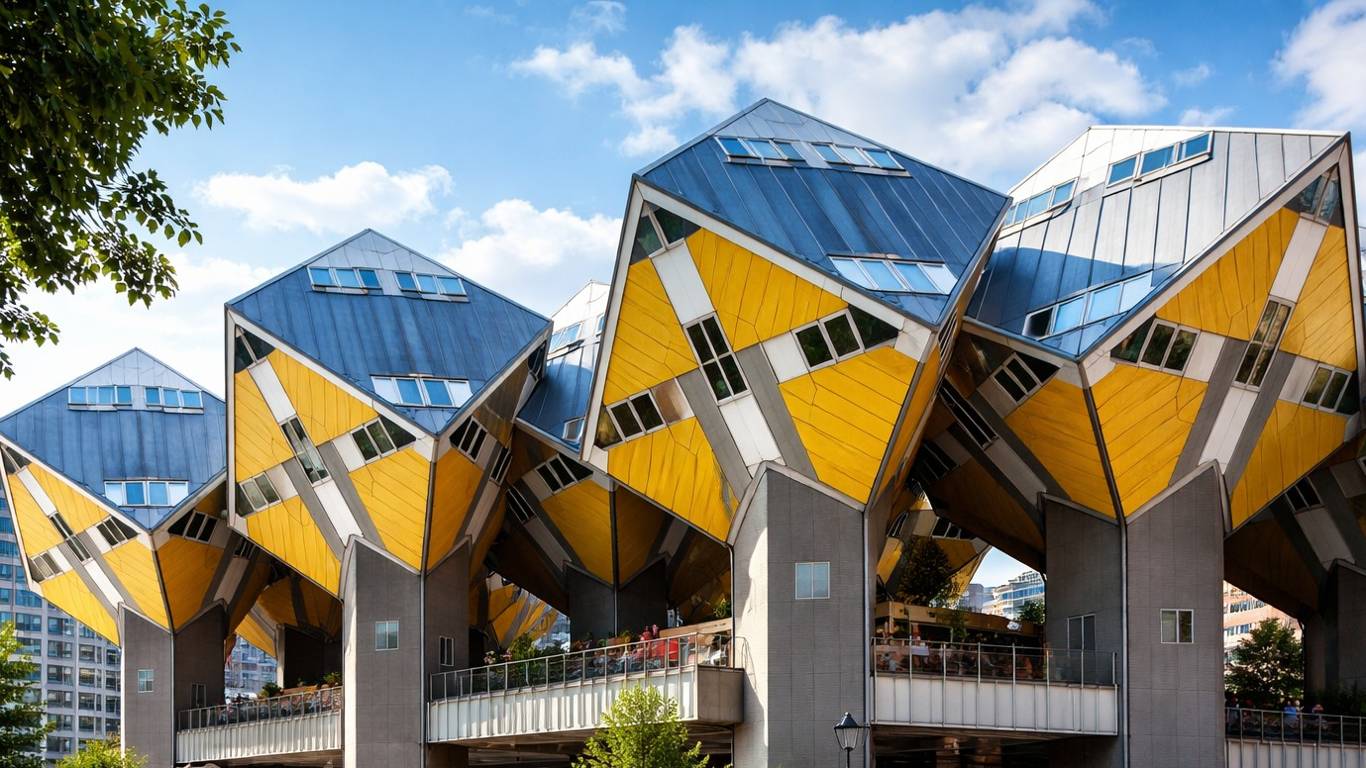 В самом центре Роттердама находятся знаменитые кубические дома, которые с первого взгляда выглядят неустойчиво. Кажется, что конструкция вот-вот потеряет равновесие, но это лишь иллюзия. Здания наклонены под углом 45 градусов и опираются на высокие опоры, а вся система тщательно продумана.