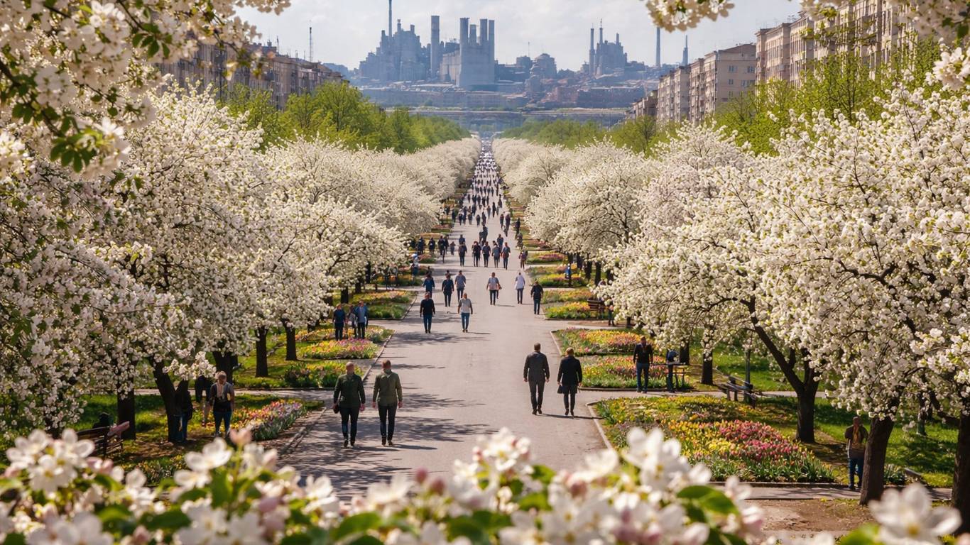 Магнитогорск редко называют «зелёным» городом — слишком уж крепко за ним закрепилась репутация индустриального гиганта. Но весной здесь происходит странная для Урала вещь: улицы, дворы и проспекты покрываются бело-розовым цветом. Причина — массовые посадки яблонь, которые начали ещё в первые годы строительства города.