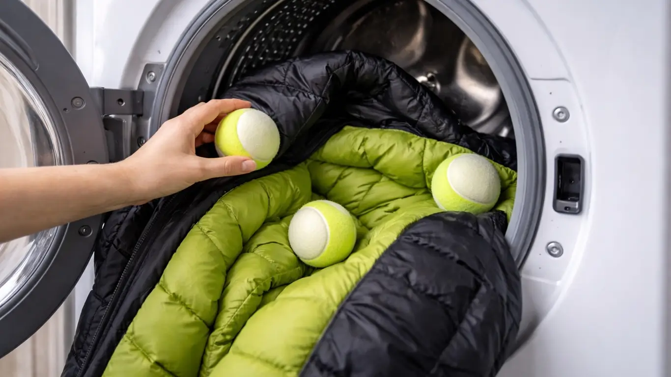 Если куртка с наполнителем, в барабан рекомендуется положить 2–5 специальных шаров или чистых теннисных мячей. Они предотвращают сбивание утеплителя и помогают равномерно распределить его внутри изделия. Перед использованием мячики желательно проверить на стойкость окраски, чтобы избежать появления пятен.