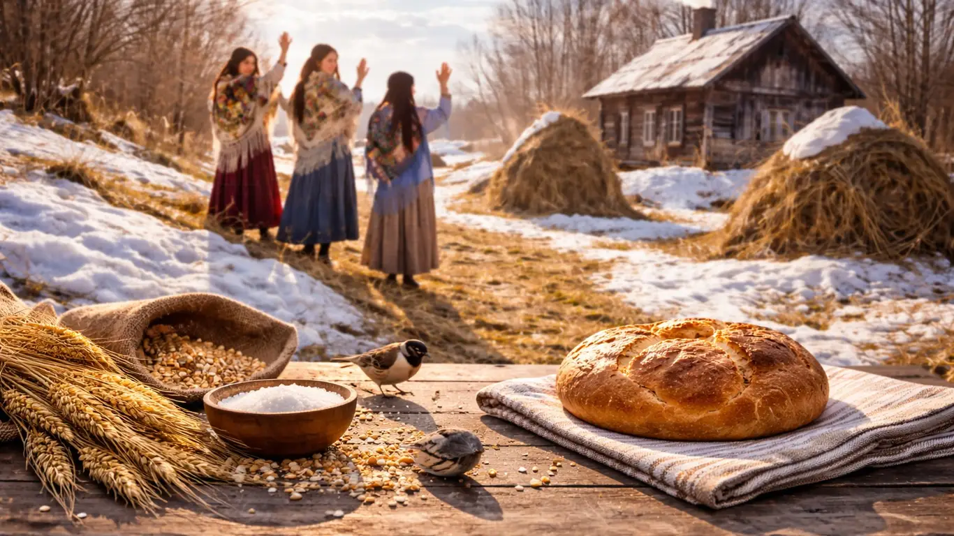 Девушки поднимались на возвышенности и «закликали» солнце, призывая тепло, ранние дожди и возвращение птиц. Хозяйки обязательно пекли каравай — символ солнца, достатка и благополучия. Хлебом угощали родных, соседей и нуждающихся. Крошки и щепотку соли бросали птицам — на богатый урожай.