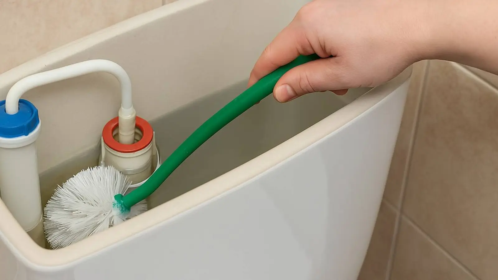 Un amestec din 1 litru de apă călduță și 100 de grame de acid citric dizolvă depunerile. Toarnă-l în rezervor pentru 1–2 ore — sau, și mai bine, lasă-l peste noapte. Apoi șterge pereții cu o perie cu coadă lungă și clătește bine, acționând plutitorul și mecanismul de descărcare, ca să nu rămână soluție.